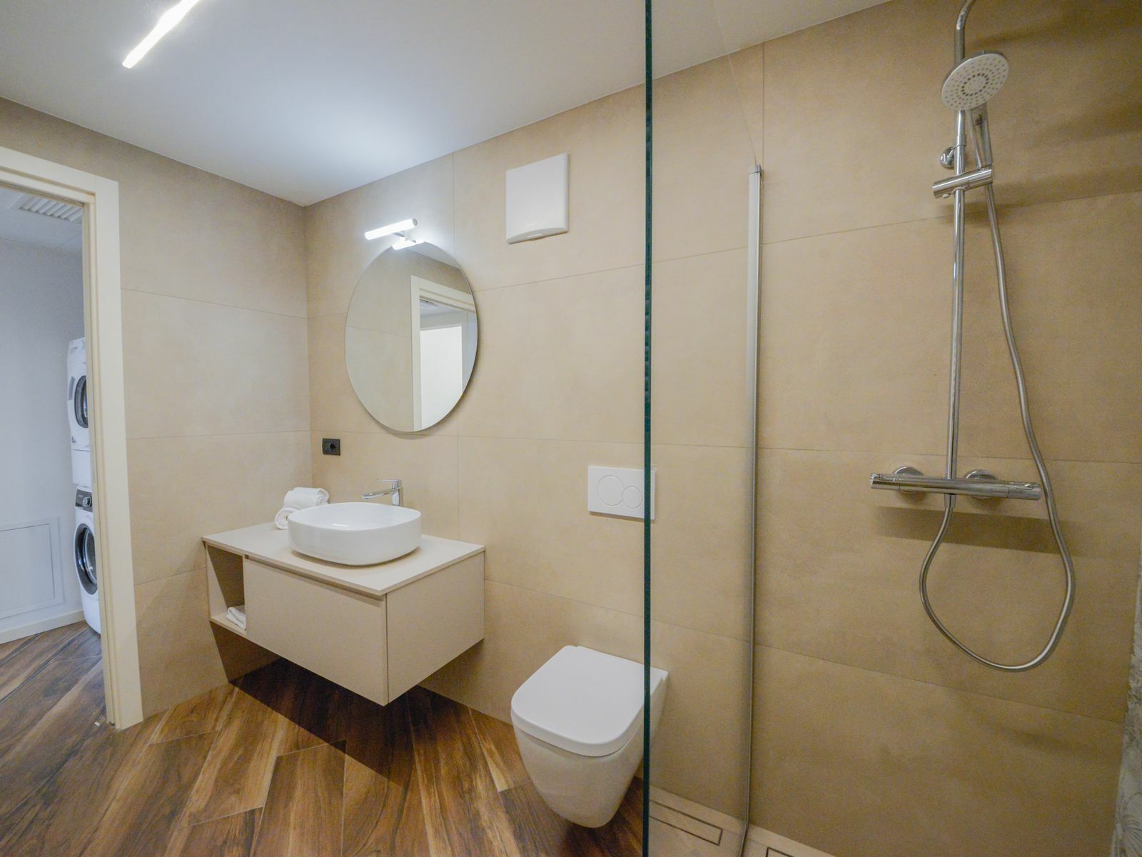La zona giorno è uno spazio accogliente dove ritrovarsi al rientro dalle attività, con cucina completamente attrezzata, divano letto matrimoniale e TV Hotel. Il secondo bagno, dotato di doccia, lavatrice e asciugatrice, rende il soggiorno ancora più pratico.