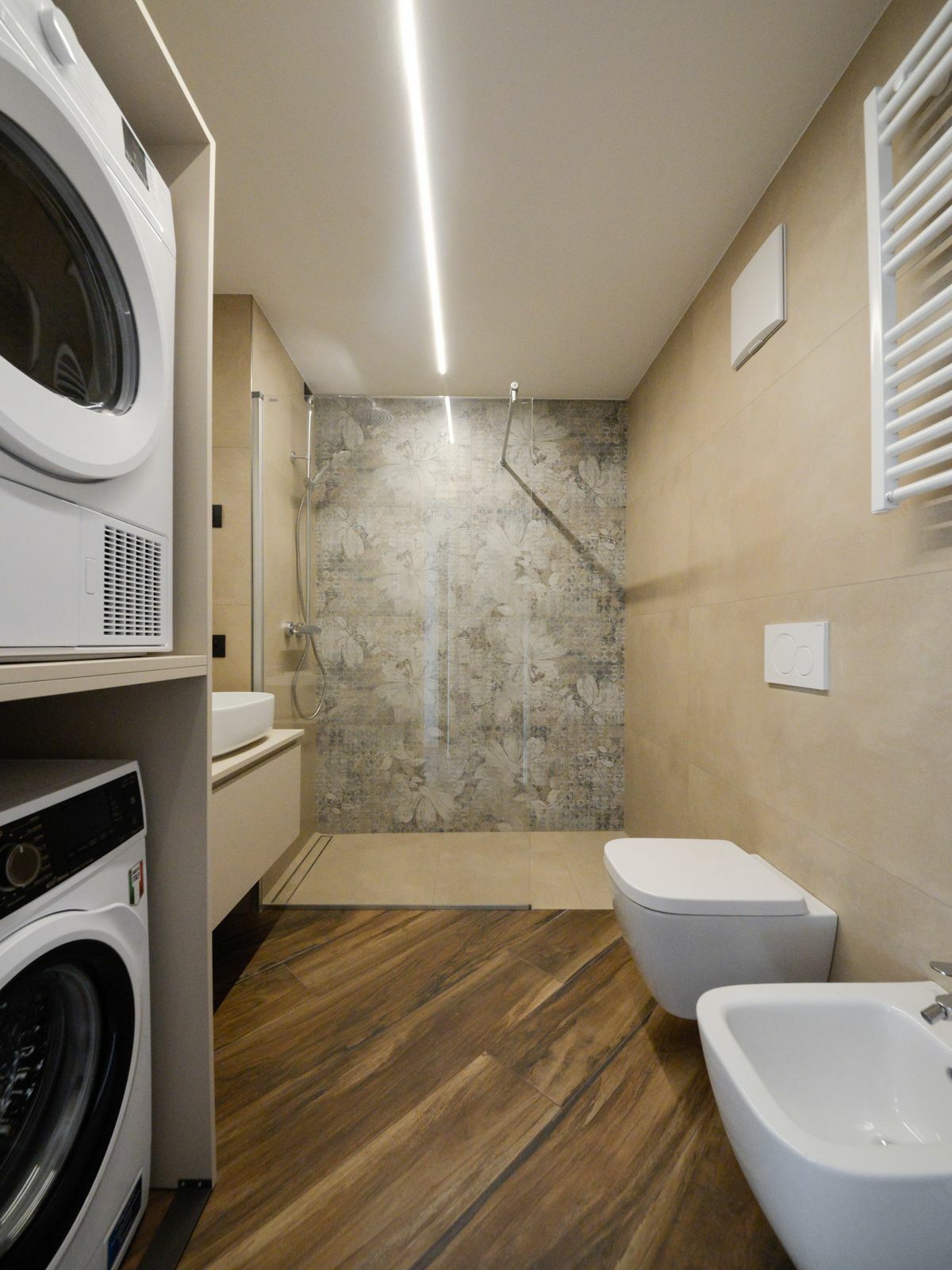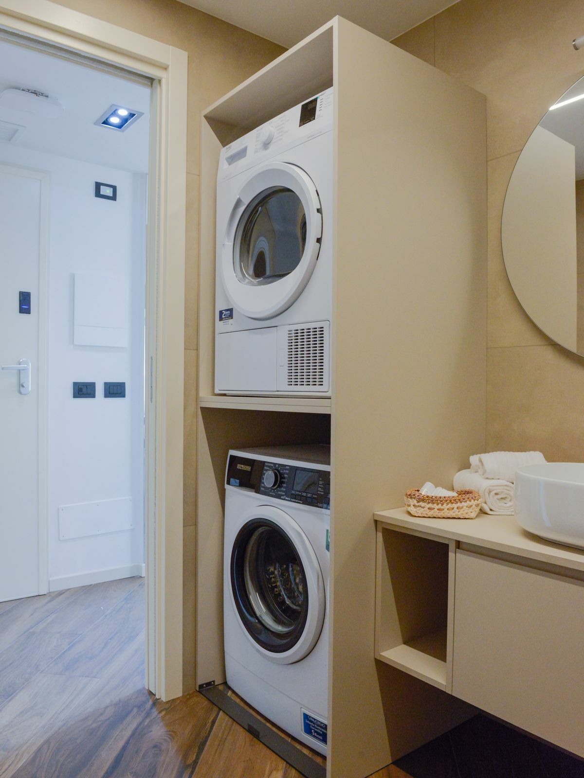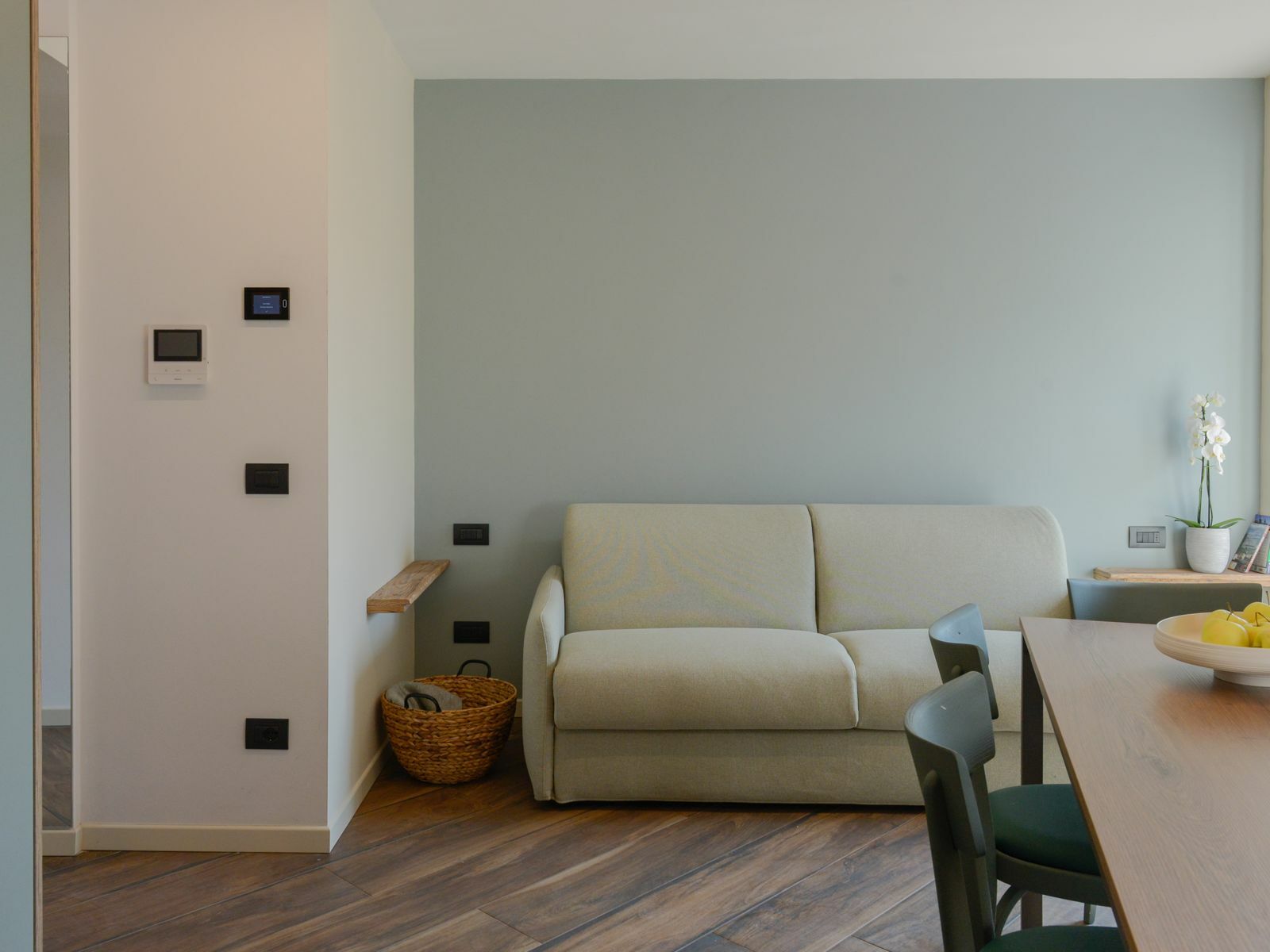 La zona giorno è uno spazio accogliente che ospita una cucina completamente attrezzata, divano letto e TV Hotel. Il secondo bagno, dotato di doccia, lavatrice e asciugatrice, rende il soggiorno pratico e funzionale.